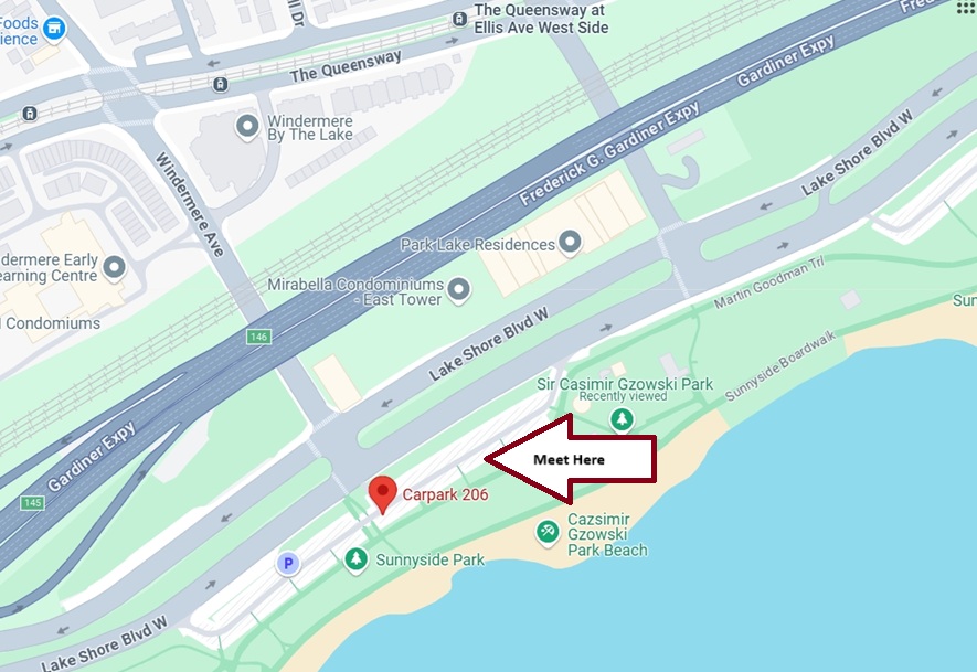 By Car – Park in “Sir Casmir Gzowski lot 206”  West end of park at the base Windermere at Lakeshore blvd.